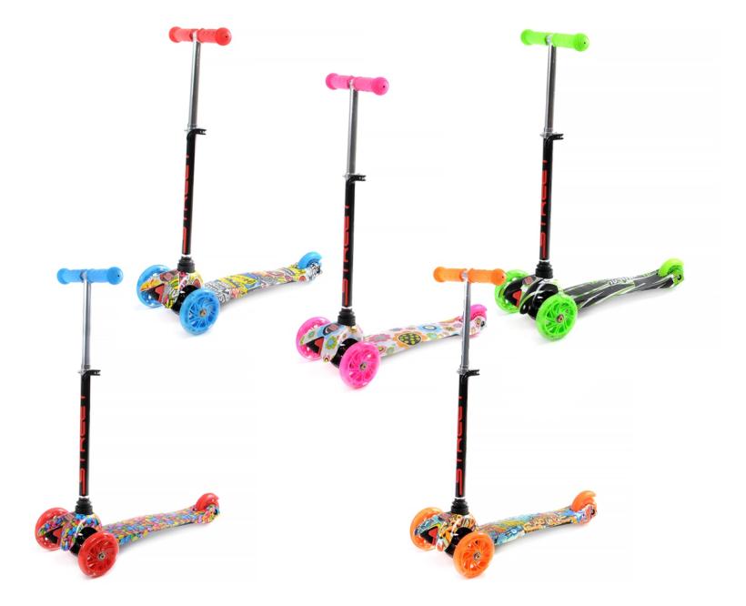 Так самокат обретает стильный и неповторимый дизайн с 5 вариантами принтов в сочетании с яркими расцветками колес и руля.