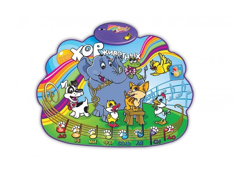 Музыкальный коврик «Хор животных» реагирует на касание. Коврик воспроизводит звуки пианино при нажатии на изображение ноток и "голоса" семи зверей и птиц при нажатии на соответствующую картинку. Дополнительно к этому, музыкальный коврик может проигрывать различные мелодии.