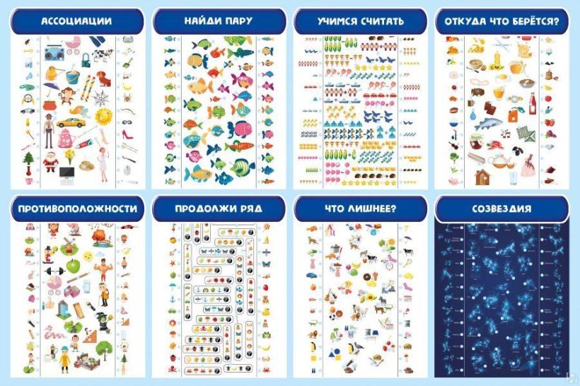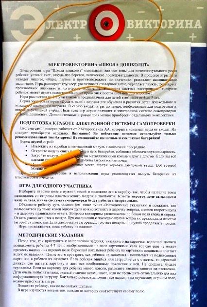 Комплект: 8 игровых полей, электронная система для самопроверки, правила игры.