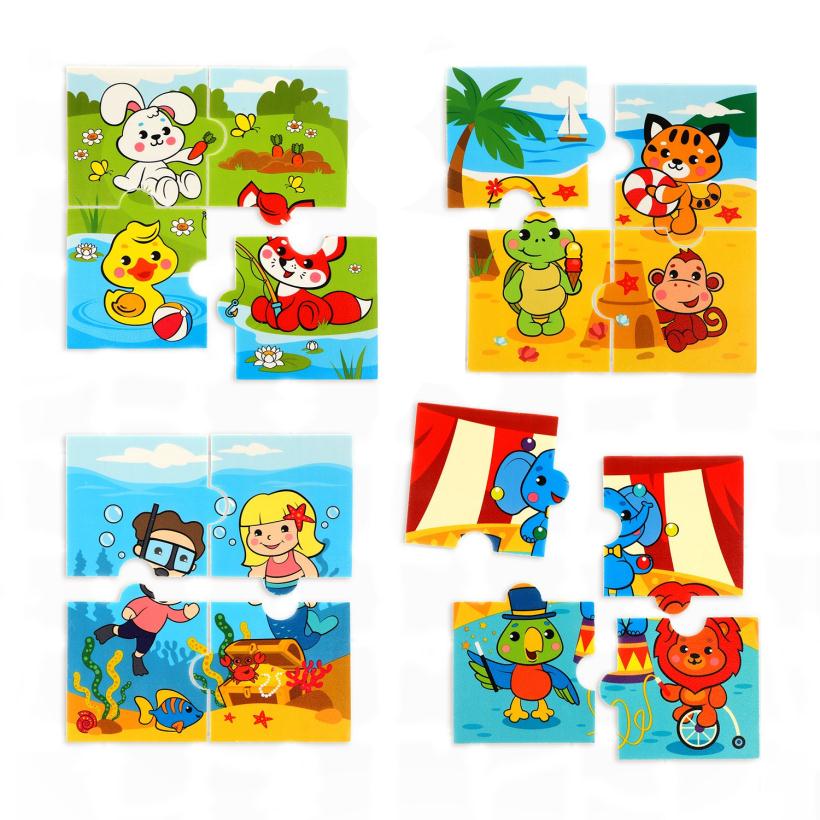 Игровой комплект состоит из 16-ти мягких карточек-пазлов, изображающих 4 различных сюжета.
