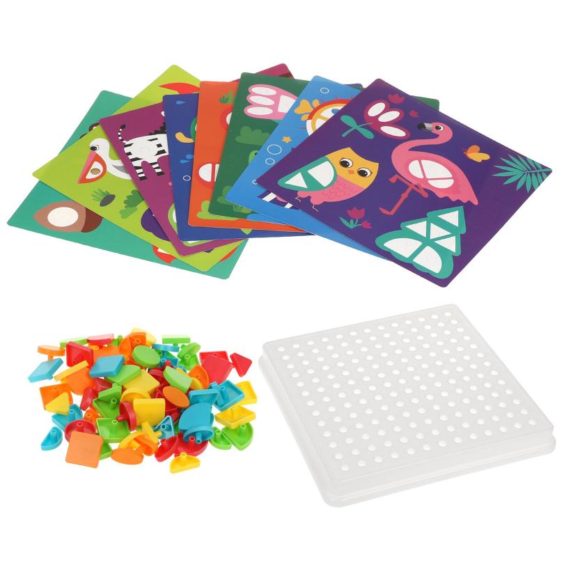 Набор включает пластиковую основу размером (ДхШ) 24х24 см, 85 деталей безопасного для малышей размера, 8 карточек с 28-ю заданиями и мешочек для хранения.