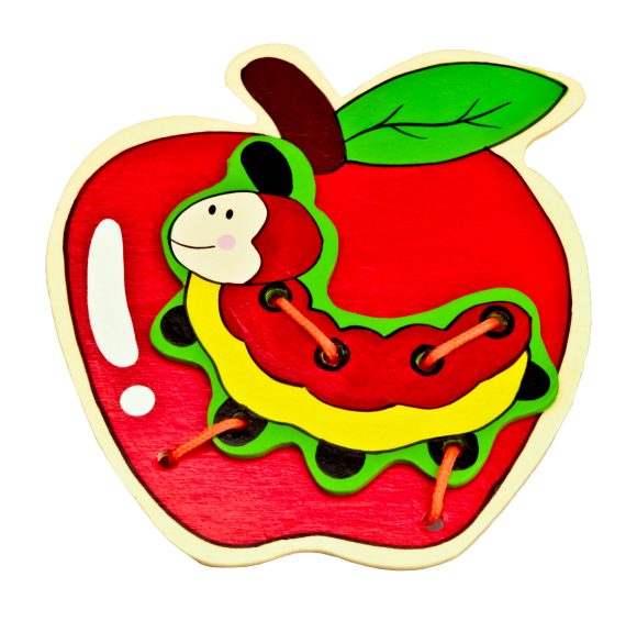 - Шнуровка состоит из основы-яблочка красного цвета, фигурки забавной гусеницы, а также разноцветных шнурков.