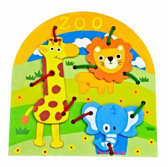 Собрать слоненка, жирафа и льва вместе на лужайке с помощью обыкновенной шнуровки позволит игрушка «Животные» от Mapacha.