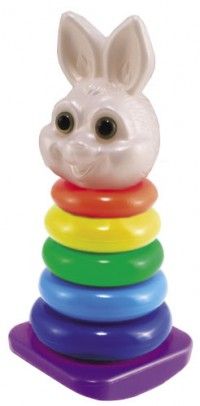 Этот веселый «Кролик» представляет собой классическую пирамидку с 5 кольцами разного цвета на полукруглом основании, что позволяет ее покачивать и крутить на поверхности.