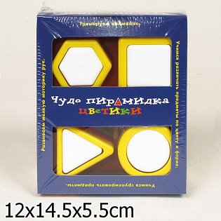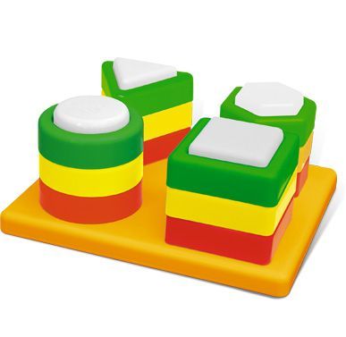 - Игрушка состоит из подставки со столбиками и пластиковых фигурок 4-х геометрических форм и разных цветов.