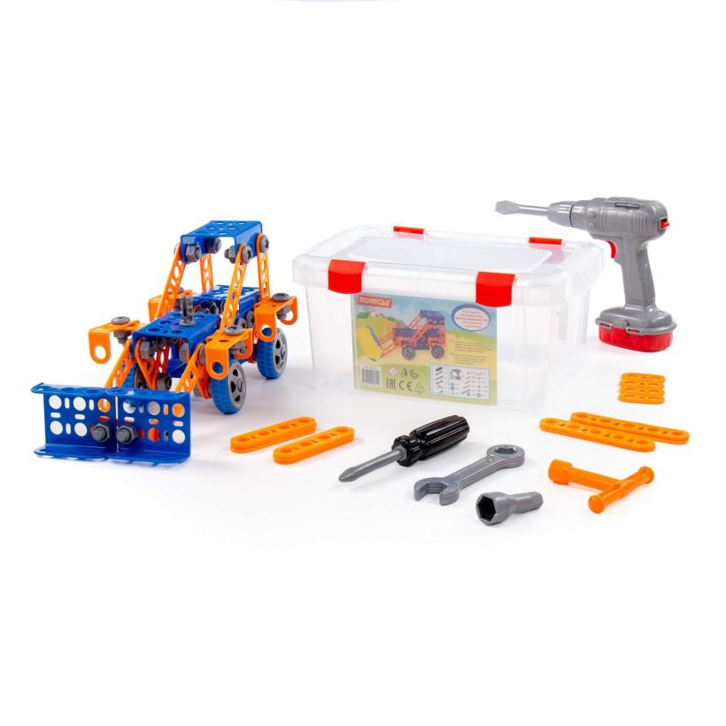 Конструктор «Изобретатель» — " Трактор-погрузчик № 1» (142 элемента) + шуруповёрт от фабрики «Полесье» отличается особым функционалом.