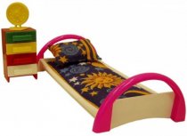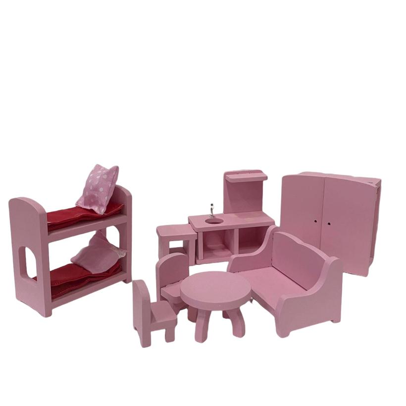 В составе набора: шкаф; стол; 2 стула, стол-тумба, диван, 2-х ярусная кровать, кухня, 2 комплекта текстильного постельного белья (подушка, одеяло)