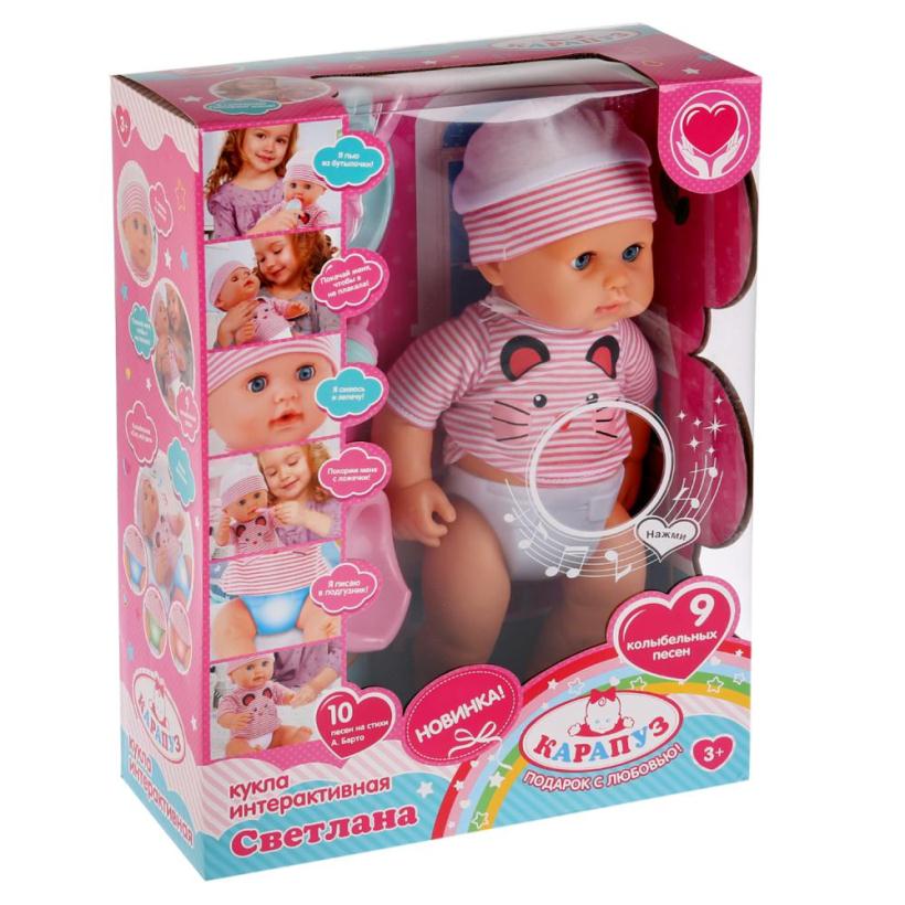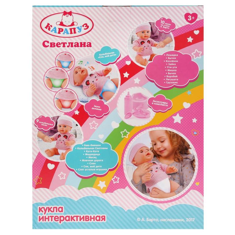 - Также игрушка оснащена звуковым модулем, позволяющим ей проигрывать 10 песен и стихов А. Барто, а также 9 колыбельных.