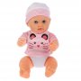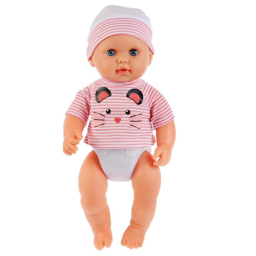 - Пупс одет в красивую бело-розовою полосатую кофточку с длинным рукавом и мордочкой мышонка на грудке, а также шапочку.