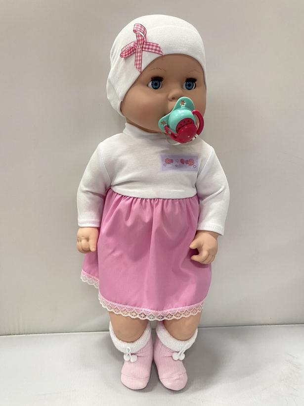 3. Во рту куклы установлена озвученная пустышка с защитной крышкой. При снятии крышки и нажатии на пустышку, малышка начинает определенное время произносить звуки, характерные для ребенка.