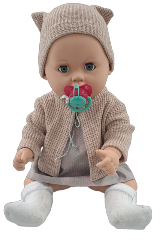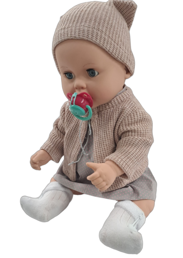 3. Во рту куклы установлена озвученная пустышка с защитной крышкой. При снятии крышки и нажатии на пустышку, малышка начинает определенное время произносить звуки, характерные для ребенка.