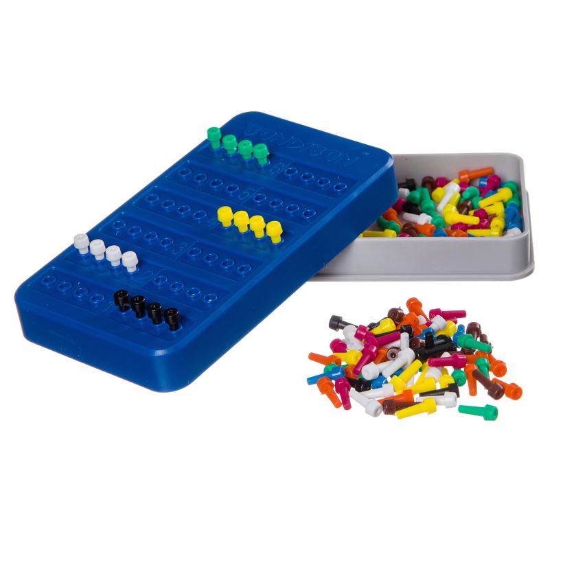В этой уникальной логической игре на двоих: один игрок загадывает комбинацию из 4-х цветных фишек, устанавливаемых в переднем углублении коробки, а другой за наименьшее число ходов должен её угадать, устанавливая на игровое поле имеющиеся в наборе фишки, кроме белых и чёрных.