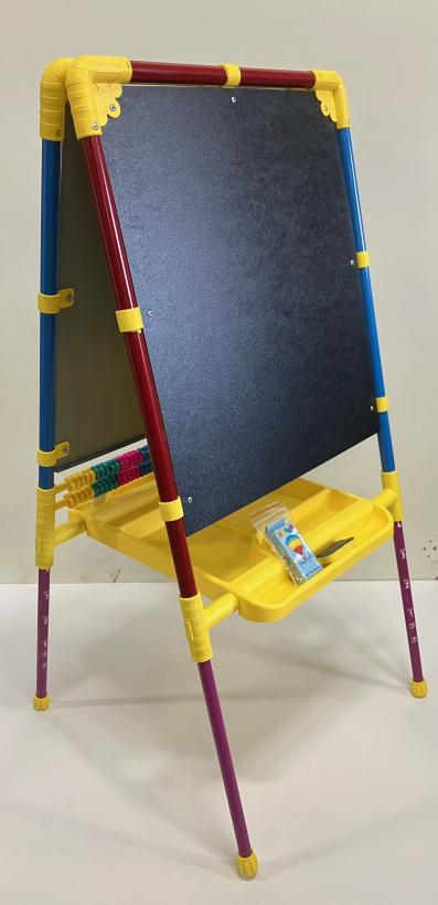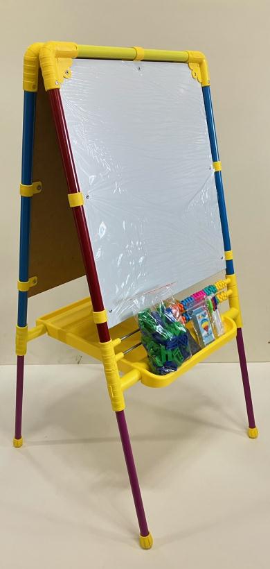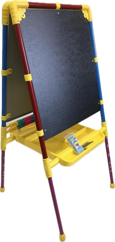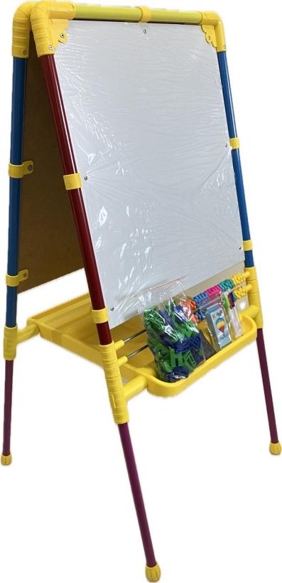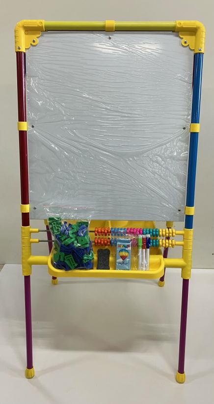 В комплекте: мольберт (рабочая поверхность 52 х 46 см), магнитная азбука, мелки, маркеры (3 цвета), губка для стирания маркера.