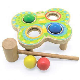 На деревянной платформе в виде ярко раскрашенной бабочки есть четыре отверстия, в которые специальным молоточком нужно забивать шарики.