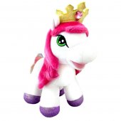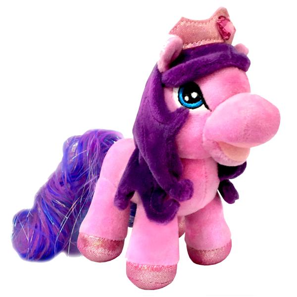 - Игрушка выполнена преимущественно в розовом цвете. У пони фиолетовая грива и синий хвост, а на голове сияет корона.