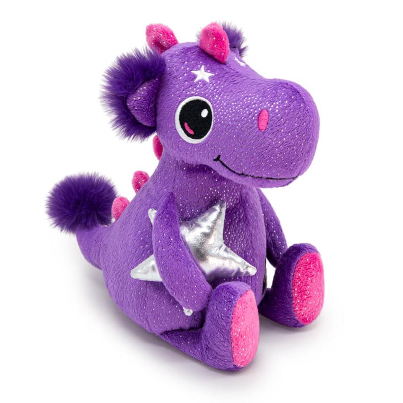 Гиацинтово-фиолетового цвета с серебристыми вкраплениями дракончик Ульге держит в лапках звезду из плотной серебряной ткани.