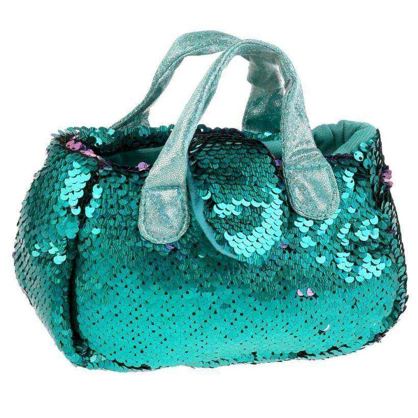 Сумка украшена множеством бирюзовых пайеток, которые переливаются на свету. Можно менять цвет пайеток проводя поперек их рукой. Ручки сумочки сделаны из блестящего материала.