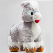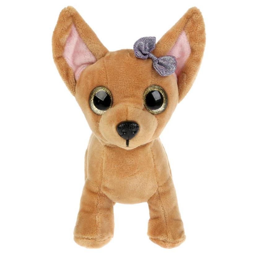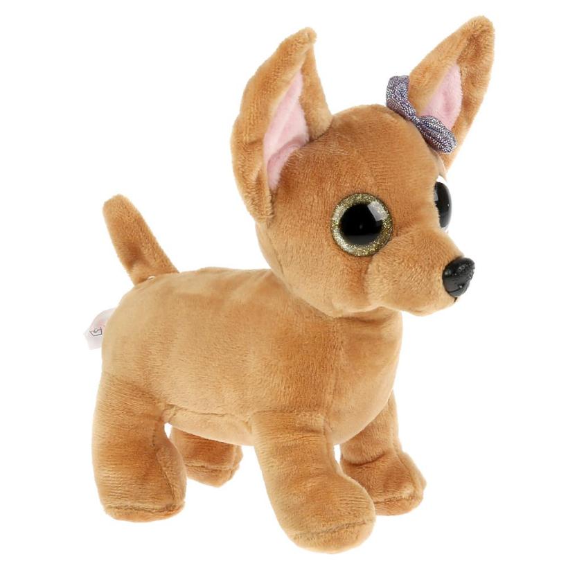 Шерстка собачки сделана из мягкого, приятного на ощупь материала. Ее приятно обнимать и гладить. Голову собачки украшает бантик.