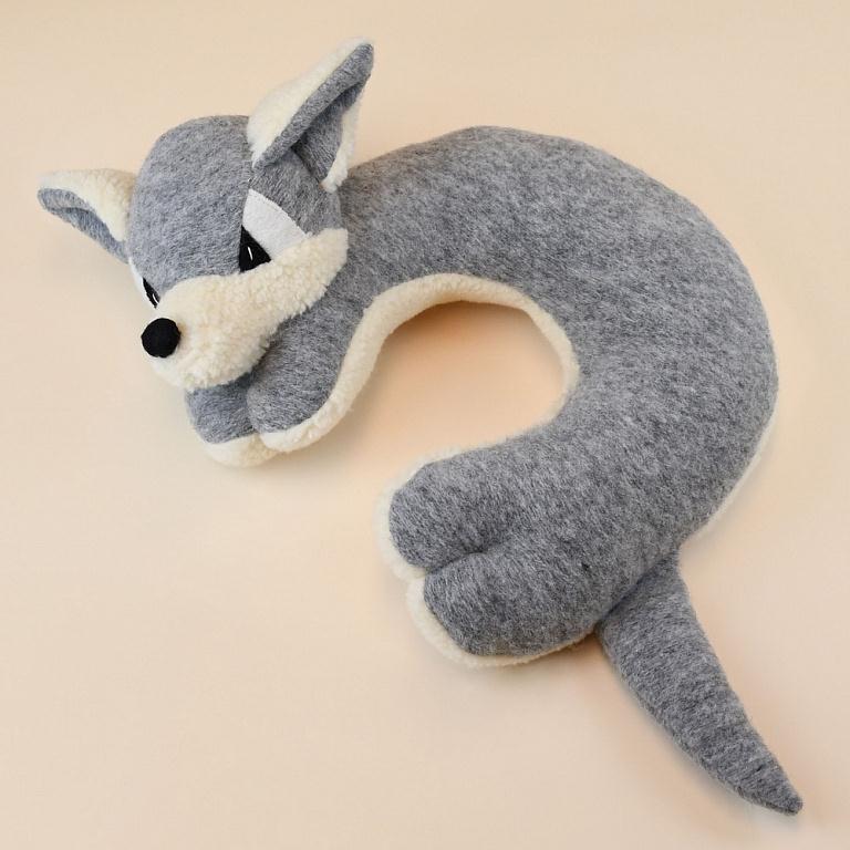 Милая подушка-рогалик в виде волка изготовлена из трикотажного полотна с чистошерстяным ворсом.
