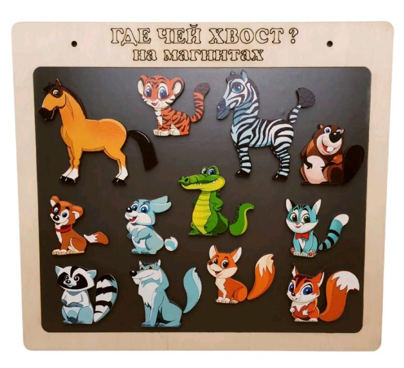 С помощью этой игры ребенок научится правильно называть животных, различать их по окраске и другим внешним признаками. Попросите малыша назвать по очереди всех животных, которых он видит на доске и рассказать, что он знает о каждом из них (цвет шерсти, где живет, чем питается, героем каких сказок является и т.д.). Задавайте ребенку наводящие вопросы и помогайте, если он затрудняется с ответом. Предложите малышу выполнить несколько заданий: снимите с доски все магниты с изображениями хвостов, попросите малыша внимательно рассмотреть каждый хвост, определить, какому животному он принадлежит, и разместить его в соответствующем месте магнитной доски. Усложните задание, оставив на доске магниты с изображениями хвостов. Ребенок должен угадать, кому принадлежит тот или иной хвост и правильно расположить животное рядом с ним, подставьте нескольким животным чужие хвосты и попросите малыша найти и исправить ошибки.