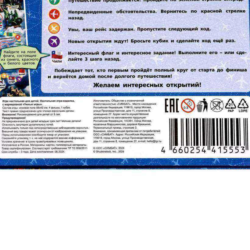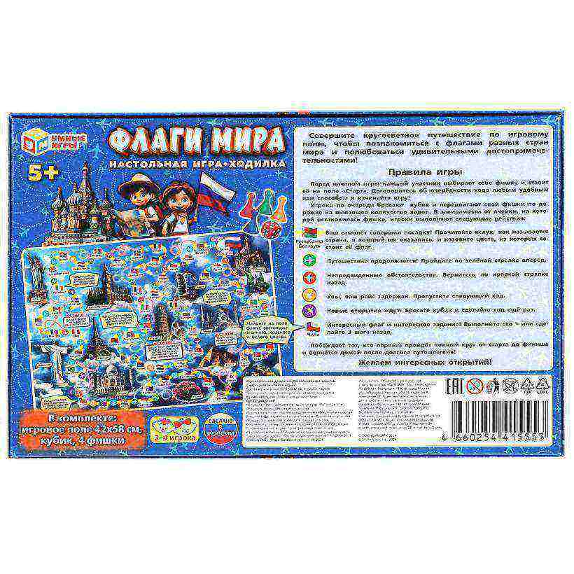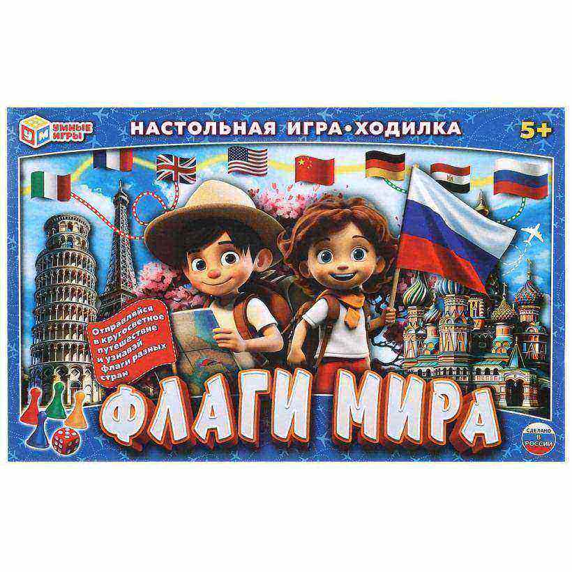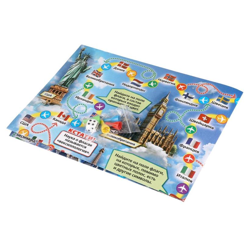 Совершите кругосветное путешествие по игровому полю, чтобы познакомиться с флагами разных стран мира и полюбоваться удивительными достопримечательностями!