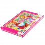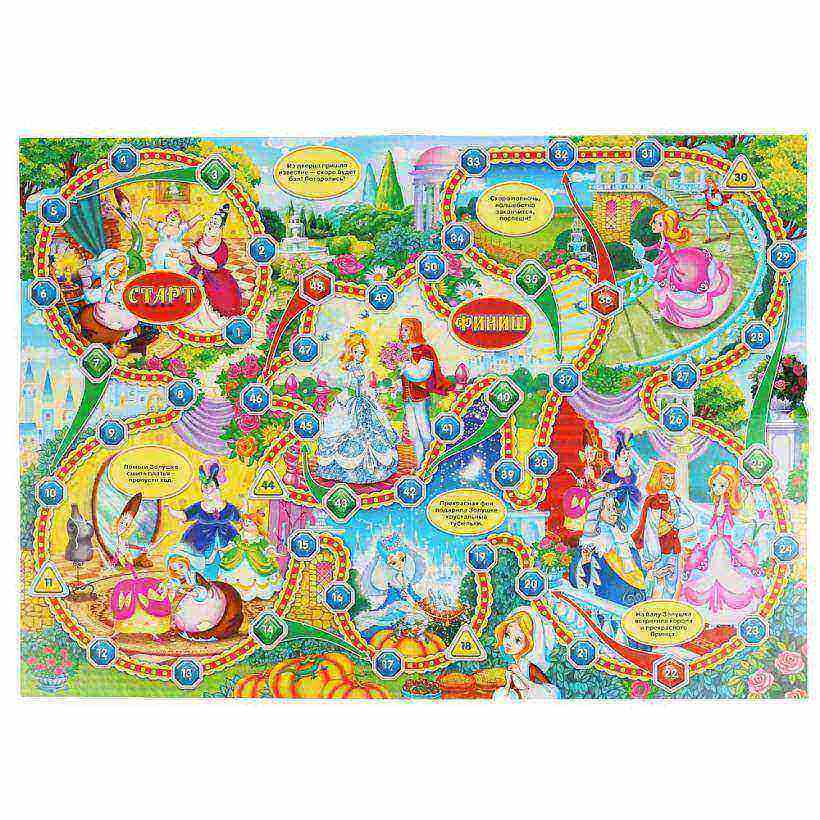 В наборе предусмотрено яркое игровое поле с красочными иллюстрациями, кубик и фишки разных цветов (4 шт.).
