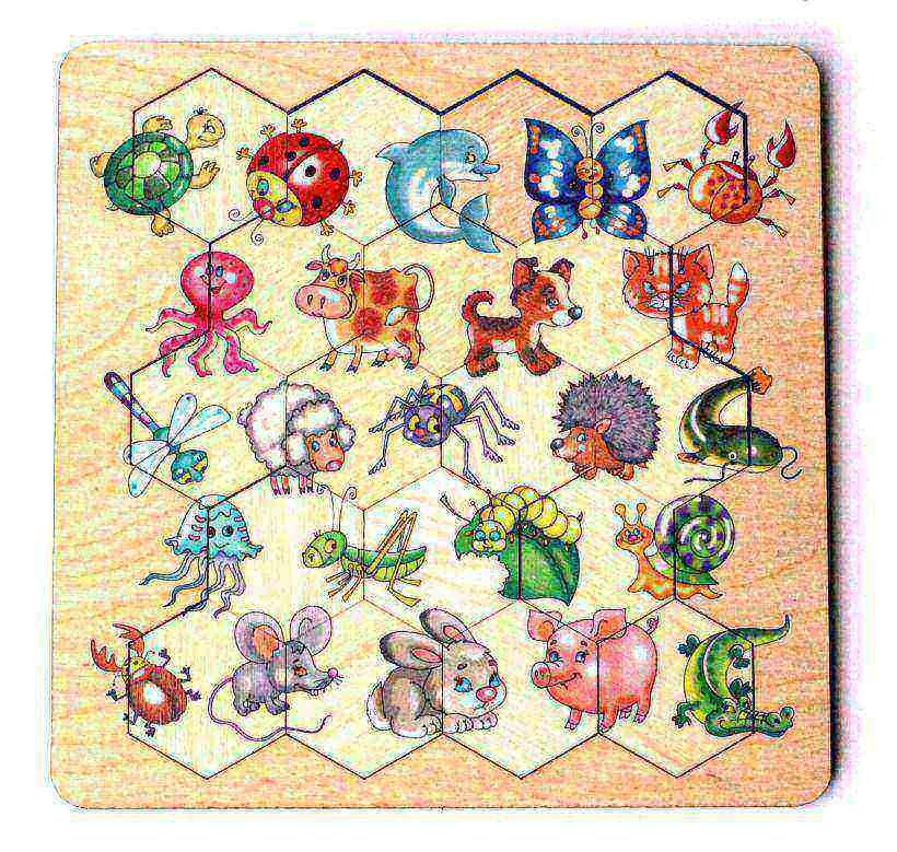 Занимательные соты» – это развивающая игра в виде деревянного пазла с оригинальными шестигранными фишками.