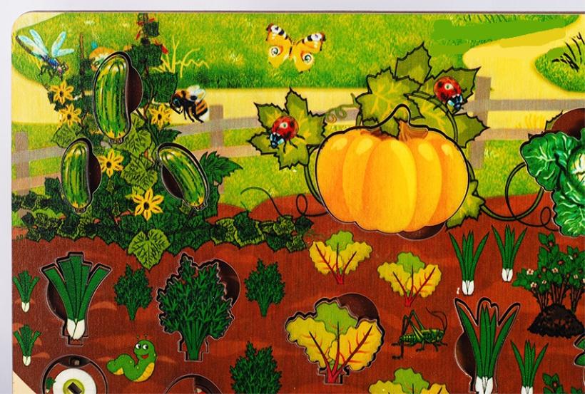 В рамке предусмотрены 34 фигурных выемки для аналогичного количества вкладышей в виде различных видов овощей и зелени. Подобная игрушка несет в себе не только развлекательную, но еще и познавательную функцию.