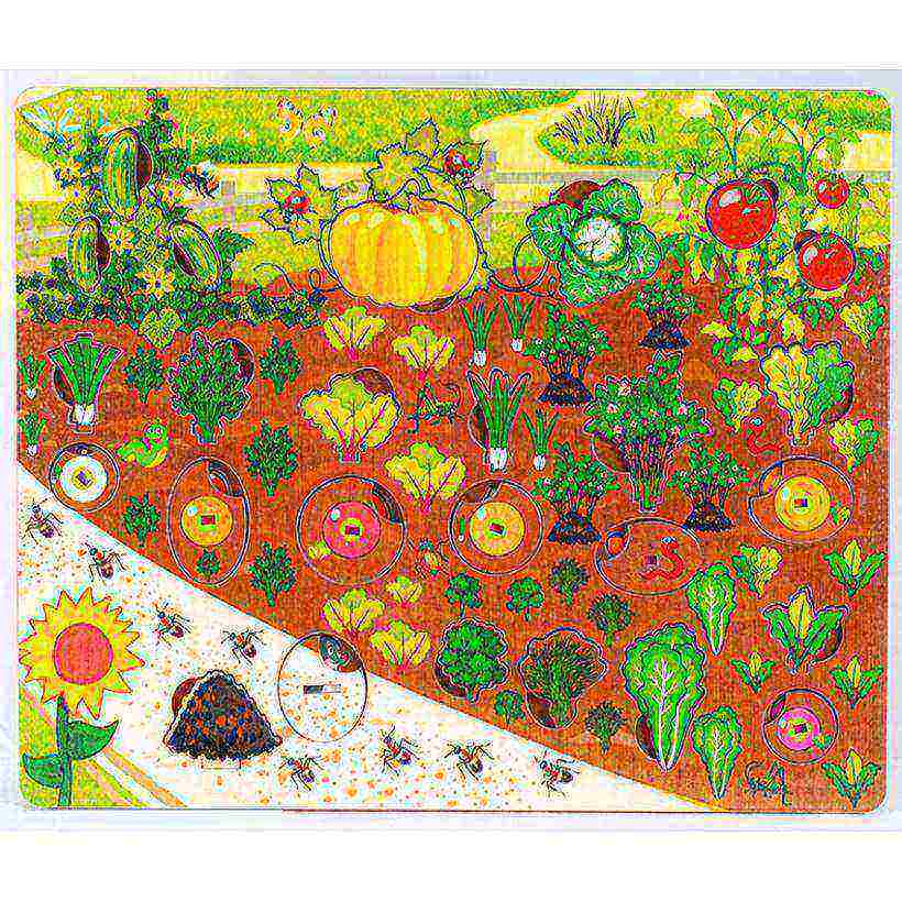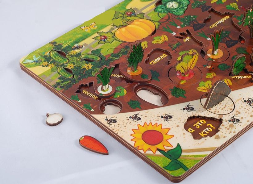 Деревянная рамка-вкладыш из серии "Нескучные игры" от бренда "Бэмби" представляет собой композицию под названием "Овощи на грядке". Деревянная доска красочно, а главное достоверно оформлена в виде грядки со вспаханной землей, спешащими куда-то муравьями и выглядывающими из своих нор кротами.