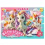 Данный пазл представляет собой игру-головоломку, в которой необходимо в правильной последовательности соединить элементы друг с другом и получить в результате красочную картинку с изображением милых единорогов. Сборка пазлов - это очень увлекательное занятие, в процессе которого дети учатся искать и совмещать детали разной формы, с каждым разом делая это всё лучше и быстрее.
