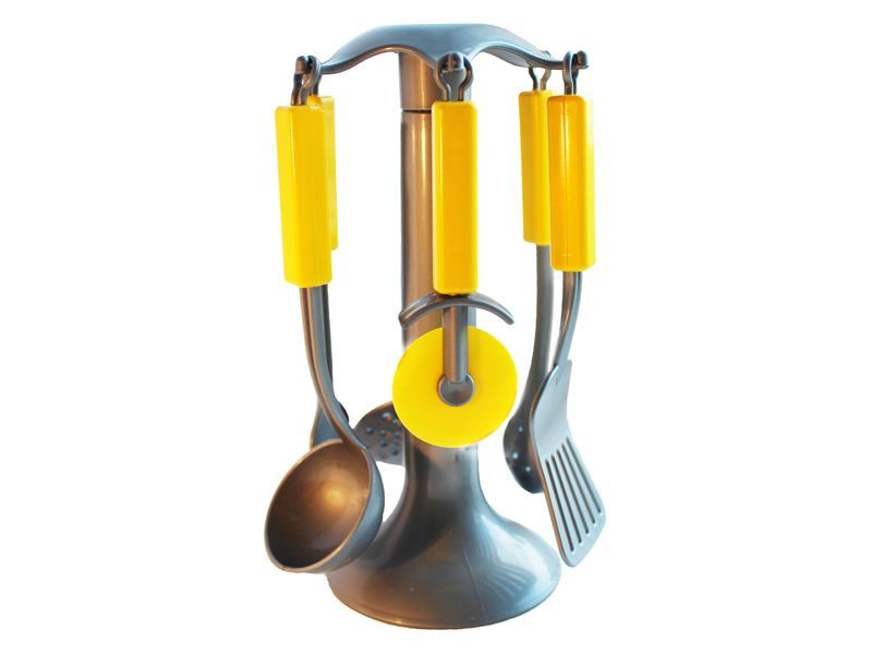 Комплект: шумовка, половник, лапшеловка, лопатка, пицца- нож, лопатка для соуса, подставка.