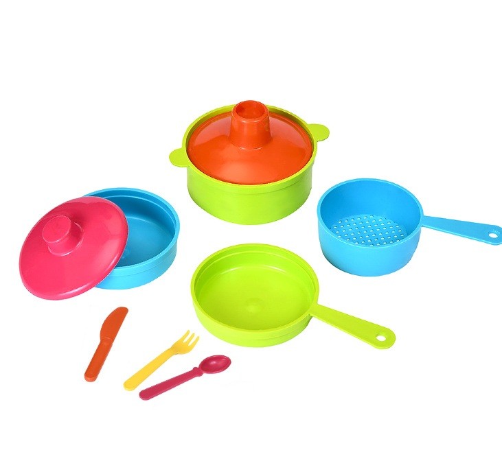 Все, что нужно для первых навыков в кулинарии, входит в набор: кастрюля и сковородка (11,6 см), миска, сито и набор столовых приборов (8-9 см).