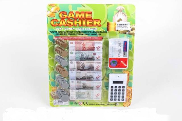 Набор игрушечных денег и монет, а также банковских карт и калькулятора может использоваться для игр с кассовым аппаратом, а также дополнить игры типа "Монополии".