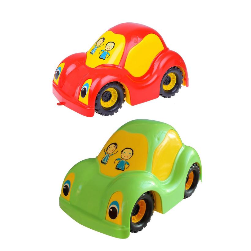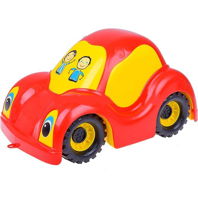 Игрушка сделана из качественной пластмассы, колесики у машинки крутятся. На лобовом стекле нарисованы два веселых человечка.