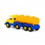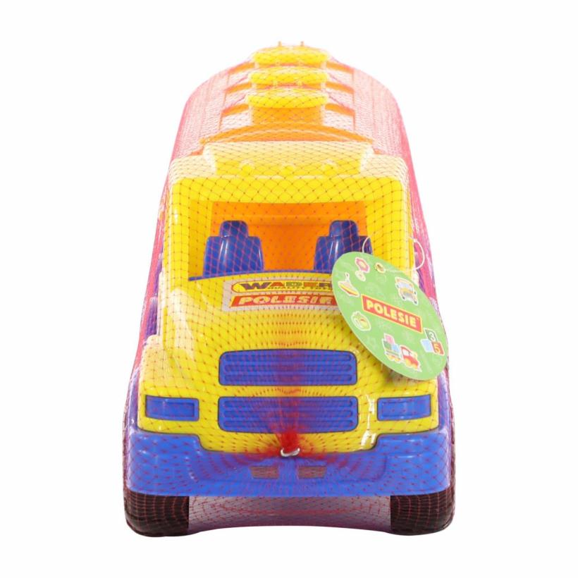 Автомобиль порадует ребёнка большим и вместительным полуприцепом с открывающимися люками, а также надёжными колёсами на металлических осях.
