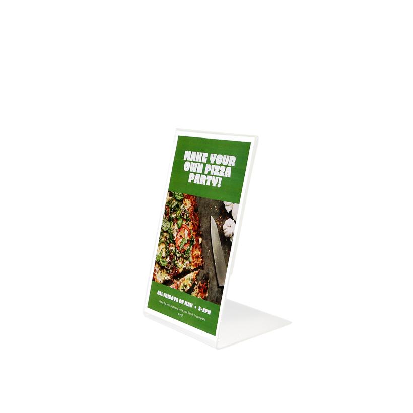 Подставка ACR-PRICER из акрила L-образная используется для размещения бумажных ценников, объявлений, рекламных листовок вертикального формата A5.