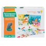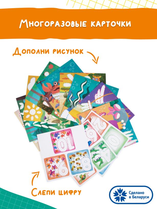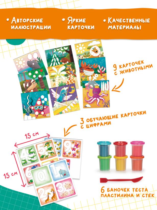 В наборе: 9 карточек с животными, 3 обучающие карточки с цифрами, 6 баночек теста-пластилина, стек.