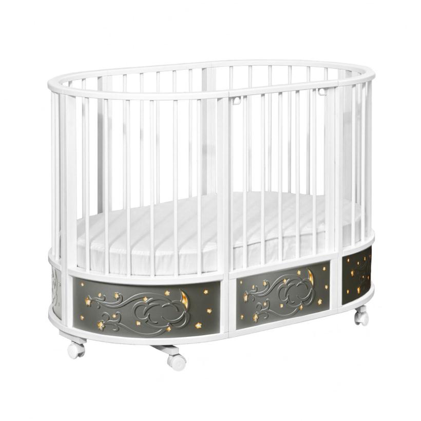 Круглая кроватка-трансформер c маятниковым механизмом поперечного качания для новорожденных изготовлена из высококачественных экологически чистых и гипоаллергенных материалов.