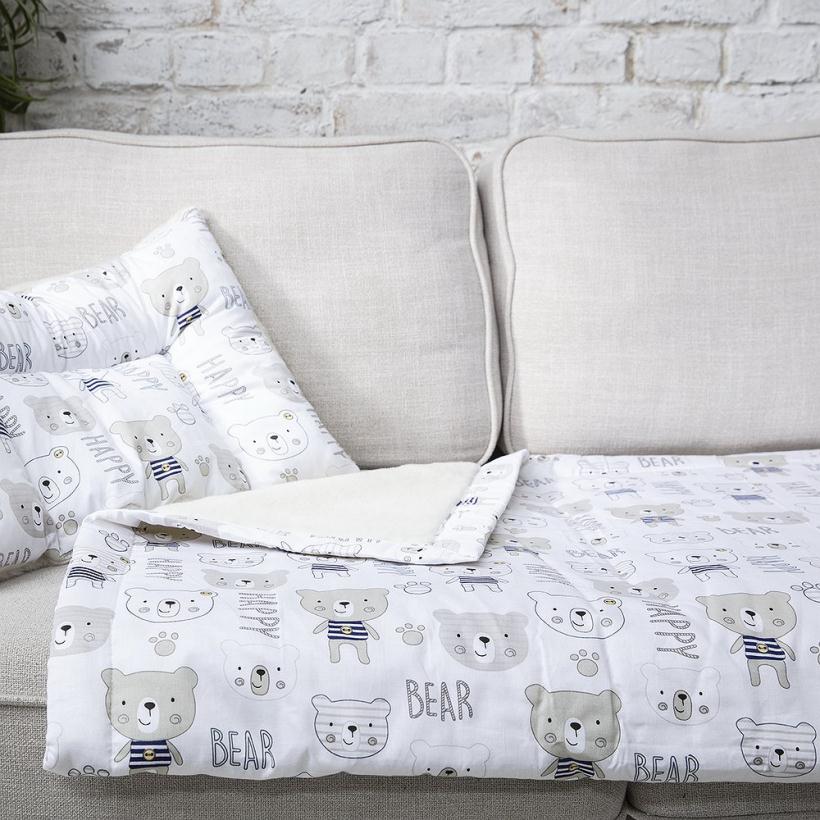 Верхняя часть одеяла выполнена из 100% хлопка с оригинальным детским рисунком, низ - из натуральной шерсти мериноса. Наполнитель - синтепон.