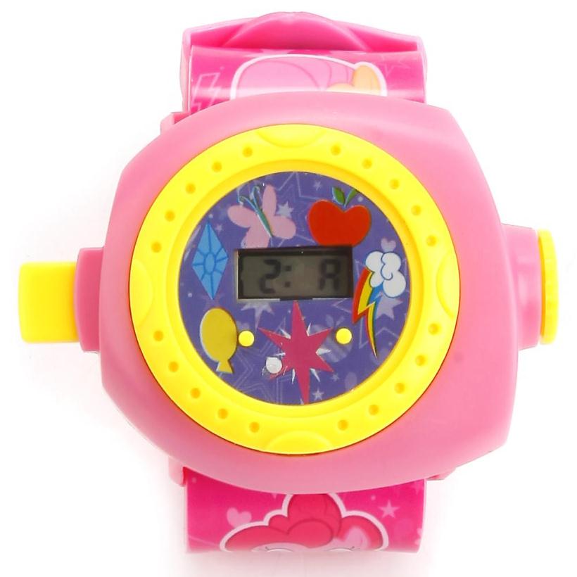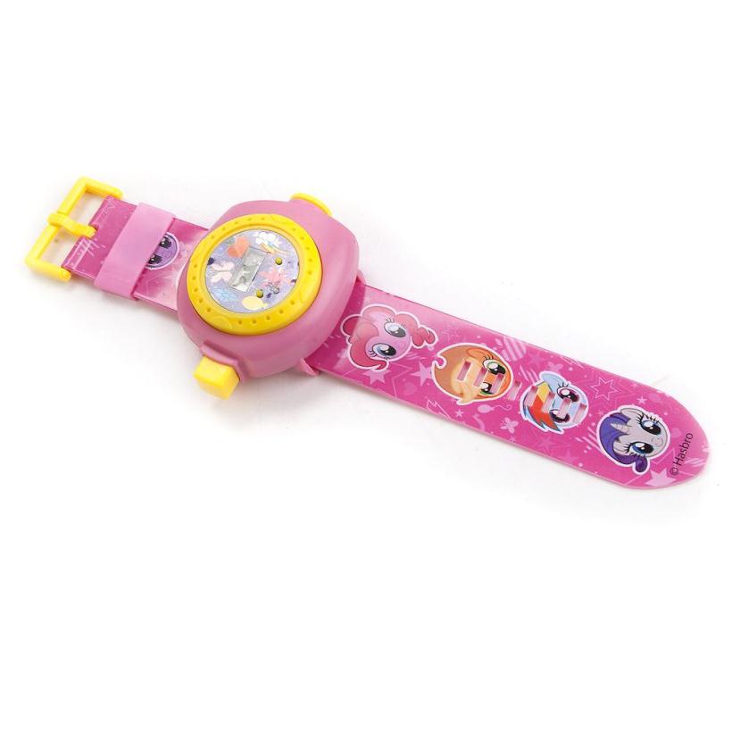 Регулируемый ремешок крашен обожаемыми персонажами, а если нажать на кнопку на корпусе можно увидеть 24 проекции с изображениями пони-героинь.