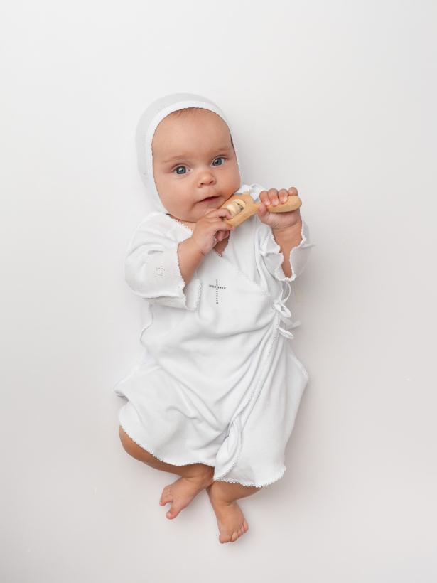 Рубашка из белоснежного интерлока комбинирована ажурным интерлоком, выполнена швами наружу с отделкой краше. Рубашка имеет завязки сбоку, украшена стразами в виде маленького крестика. Чепчик из ажурного трикотажа на тесемочках.