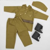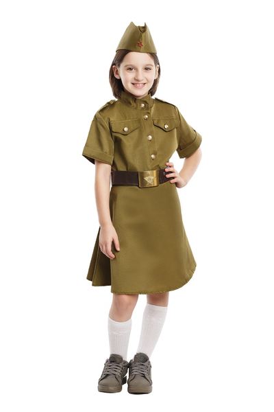 Состав комплекта: платье с коротким рукавом с металлическими пуговицами, пилотка со звездой, ремень с бляшкой.