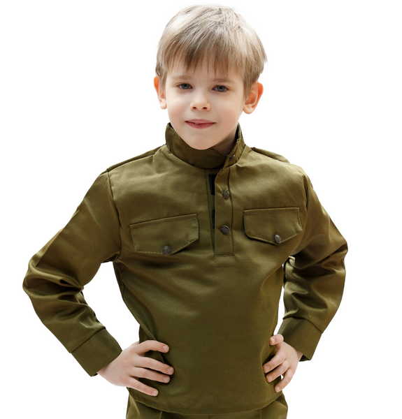 Эта гимнастерка детская стилизована под традиционную рубашку советского солдата.