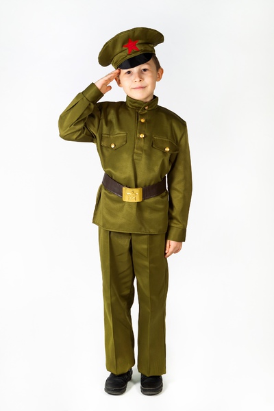 Костюм солдата поможет вашему ребенку примерить образ храброго сержанта в форменной гимнастерке с золотыми пуговицами и фуражке с красной звездой.
