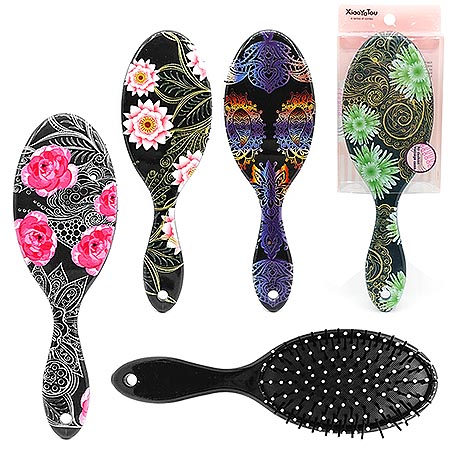 Расческа массажная KWELT "Цветы на черном" 22см на пластиковом блистере с европодвесом