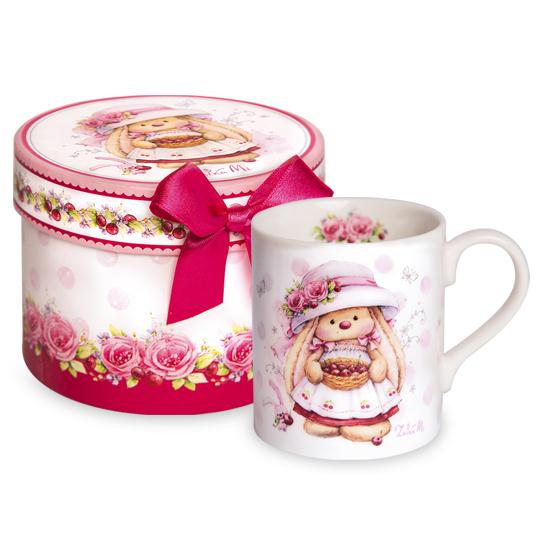 Фарфоровая кружка с авторским рисунком Зайки Ми в шляпке с цветами.