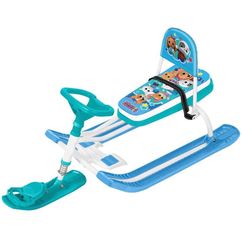 Снегокат "Кошечки-собачки" со складной спинкой для прогулок и активного отдыха детей от 4 до 7 лет. Любимые герои мультсериала на спинке и сиденье снегоката.