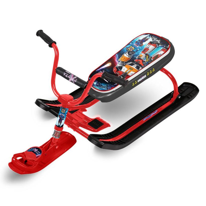 Оснащен сварной рамой из стальных труб, лыжами из морозоустойчивого пластика, комфортным сиденьем и рулем как на велосипеде!