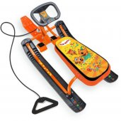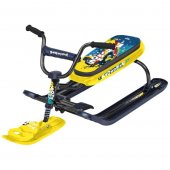 Имеет сварную конструкцию из стальных труб, пластмассовые морозостойкие лыжи и мягкое сиденье, буксировочный трос.